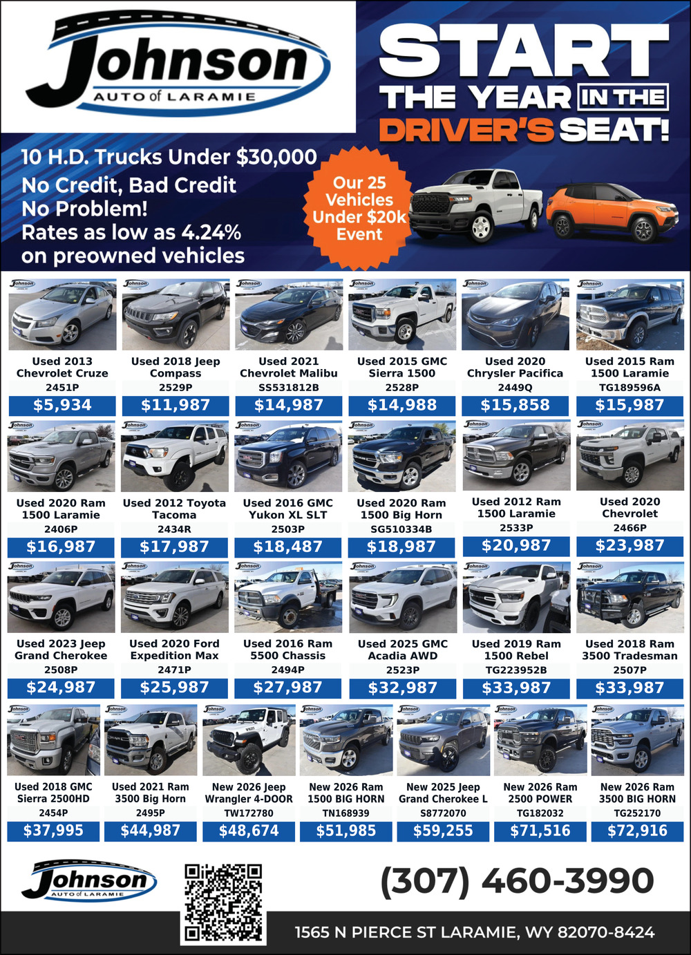 Jan 31, 2026. Johnson Auto of Laramie Auto Dealers Ads from Rawlins Daily Times